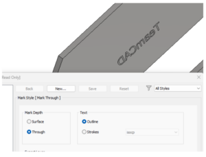 לכן אם נשנה את הגופן, למשל ל times, נוכל לשנות את הכיתוב, ניתן גם לשנות לאפשרות של Outline לקבלת צורת טקסט הדומה לאפשרות של Mark surface: