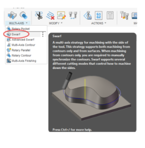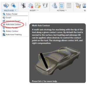 2.4 Multi-Axis Contour – משמש לכרסום עקומות על משטחים, תוך שימוש בקצה הכלי. מאפשר שליטה על מצב וזוית תנועת הכלי יחסית למשטח.