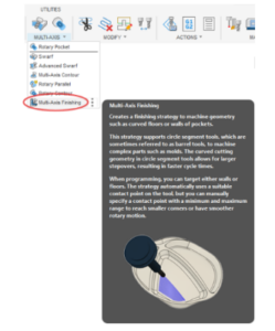 2.5 Multi Axis Finishing – מאפשר בניית מהלכי כלי רב ציריים לצורך ביצוע גימור של תחתיות ודפנות של חלקים שאינם מישוריים, תוך שימוש בכלים כדוריים או דמויי חבית.