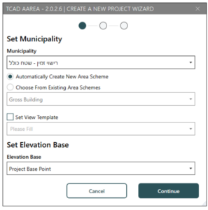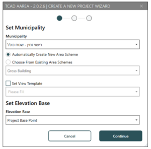 לאחר מכן, נפתח את אפליקציית חישוב שטחים AREA.A ונבחר רשות אליה נגיש (למשל "רישוי זמין – שטח כולל") ונאשר ב Continue.