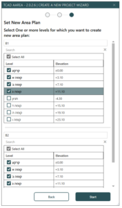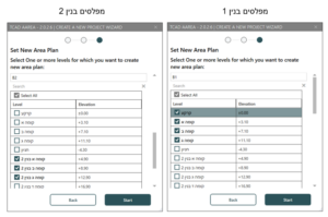 כעת נוכל לבחור מאיזה מפלסים ניצור תכניות שטחים לפי הבניין הרלוונטי (נגלול מטה כדי לראות את כל הבניינים) ונאשר ב Start. כפי שניתן לראות, אנו בוחרים את אותם המפלסים לשני הבניינים שכן הם באותו הגובה.