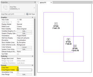 לאחר הפעלת Crop View בכל תכנית שטחים, נקטין את הגבול סביב הבניין כך שנראה בשרטוט רק את השטחים הרלוונטיים לאותו בנין.