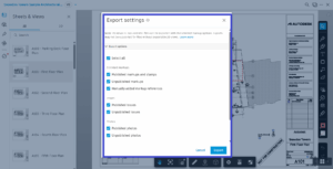 ייפתח לנו תפריט האפשרויות בו נוכל לבחור איזה מידע (בנוסף לשרטוט) נרצה לייצא, לדוגמא כל התכניות (Sheets), כל הערות (Issues) וכל העננים (Markups)