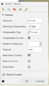 2. תחת Passes, נגדיר פרמטרי קיזוז ומיקום הכלי, כמו כן מספר מעברים נדרש.
